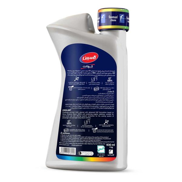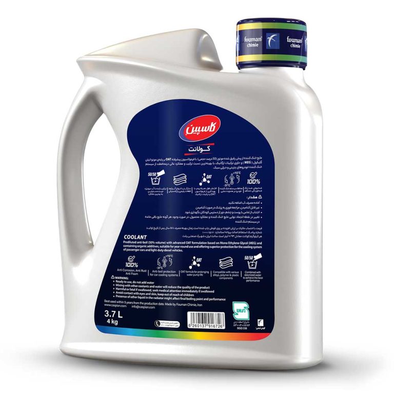 کولانت کاسپین مطابق با استاندارد شماره ۳۳۸ ایران و با فناوری OAT، آماده مصرف و بدون نیاز به رقیق‌سازی با آب می‌باشد. این ضدیخ در بهینه‌ترین نسبت (۵۰ درصد حجمی) ترکیب شده است و در محدوده دمایی ۳۷- درجه سانتی‌گراد تا ۱۱۲+ سانتی‌گراد قابل استفاده است